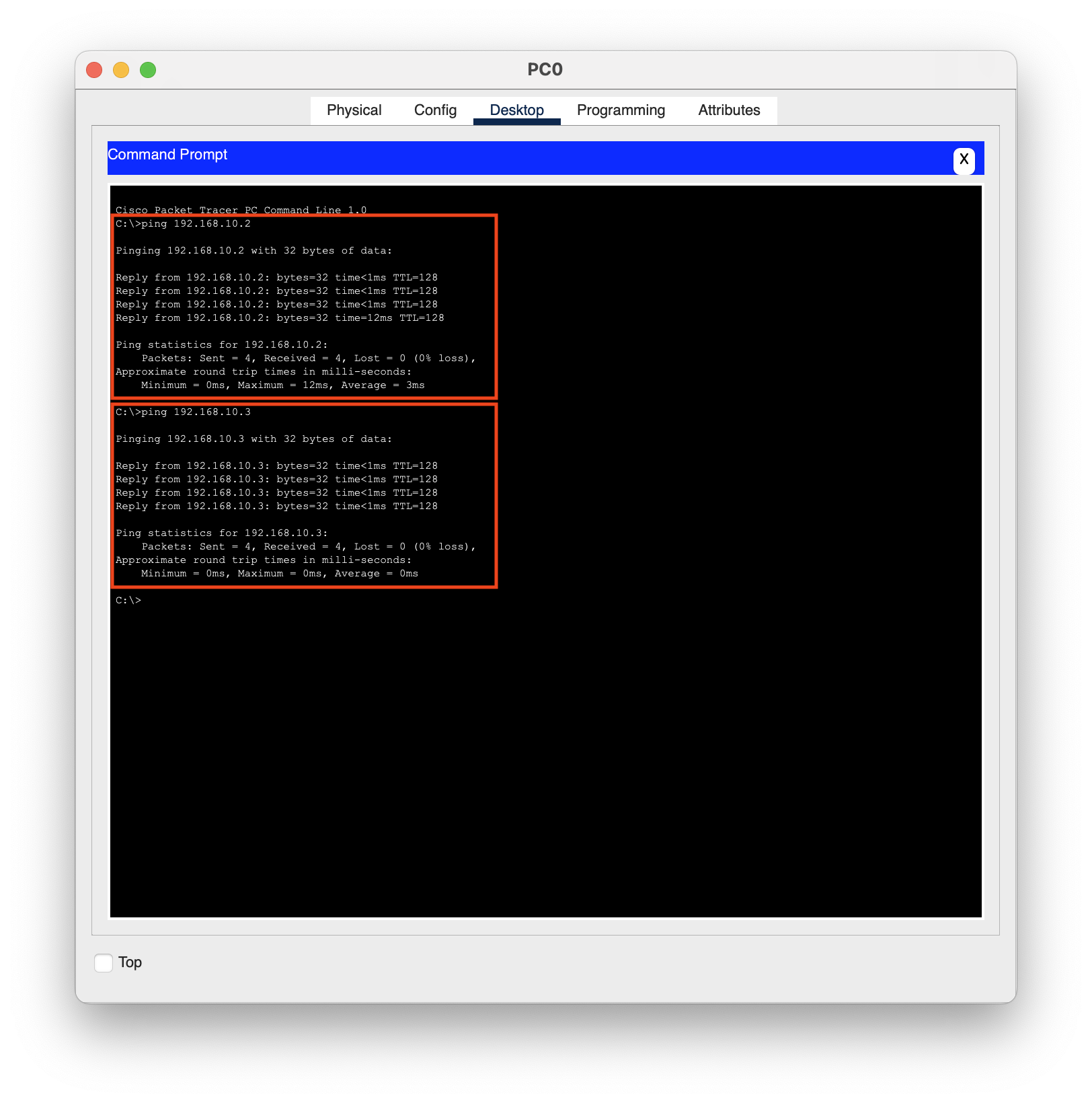 Reply from 192.168.10.2: bytes=32 time<1ms TTL=128